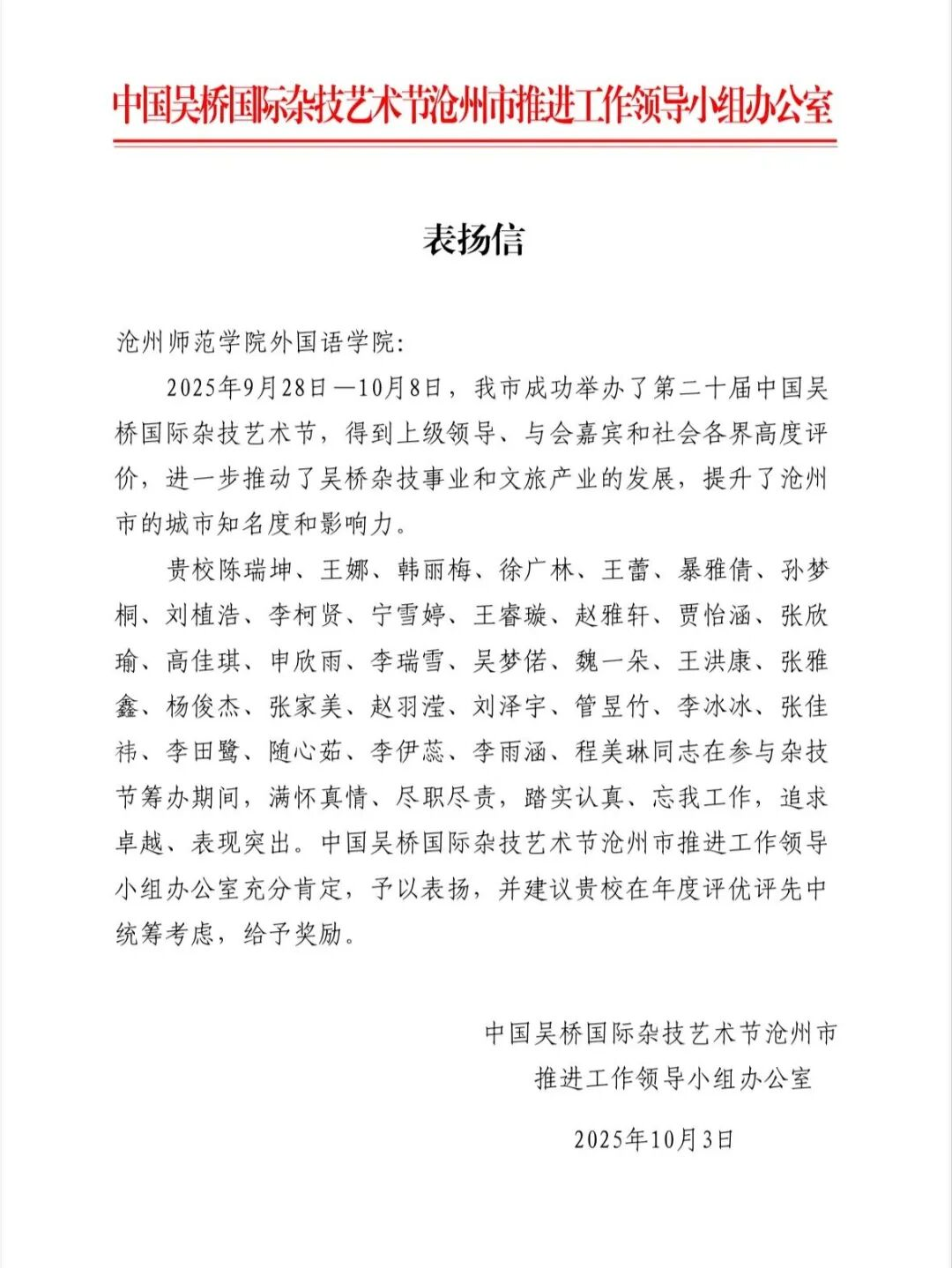 9月28日至10月8日,第二十届中国吴桥国际杂技艺术节圆满落幕。自9月19日起,外国语学院先后选派了25名学生志愿者,历时16天全程参与志愿服务,以过硬的专业能力圆满完成各项任务,为这场世界级文化盛宴筑牢国际交流纽带。