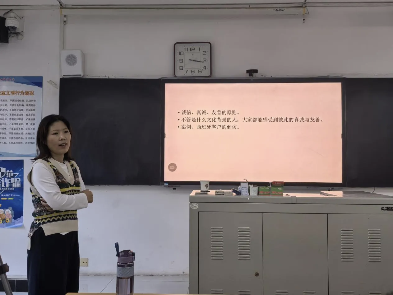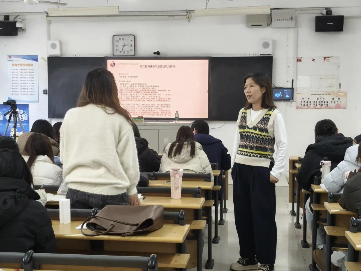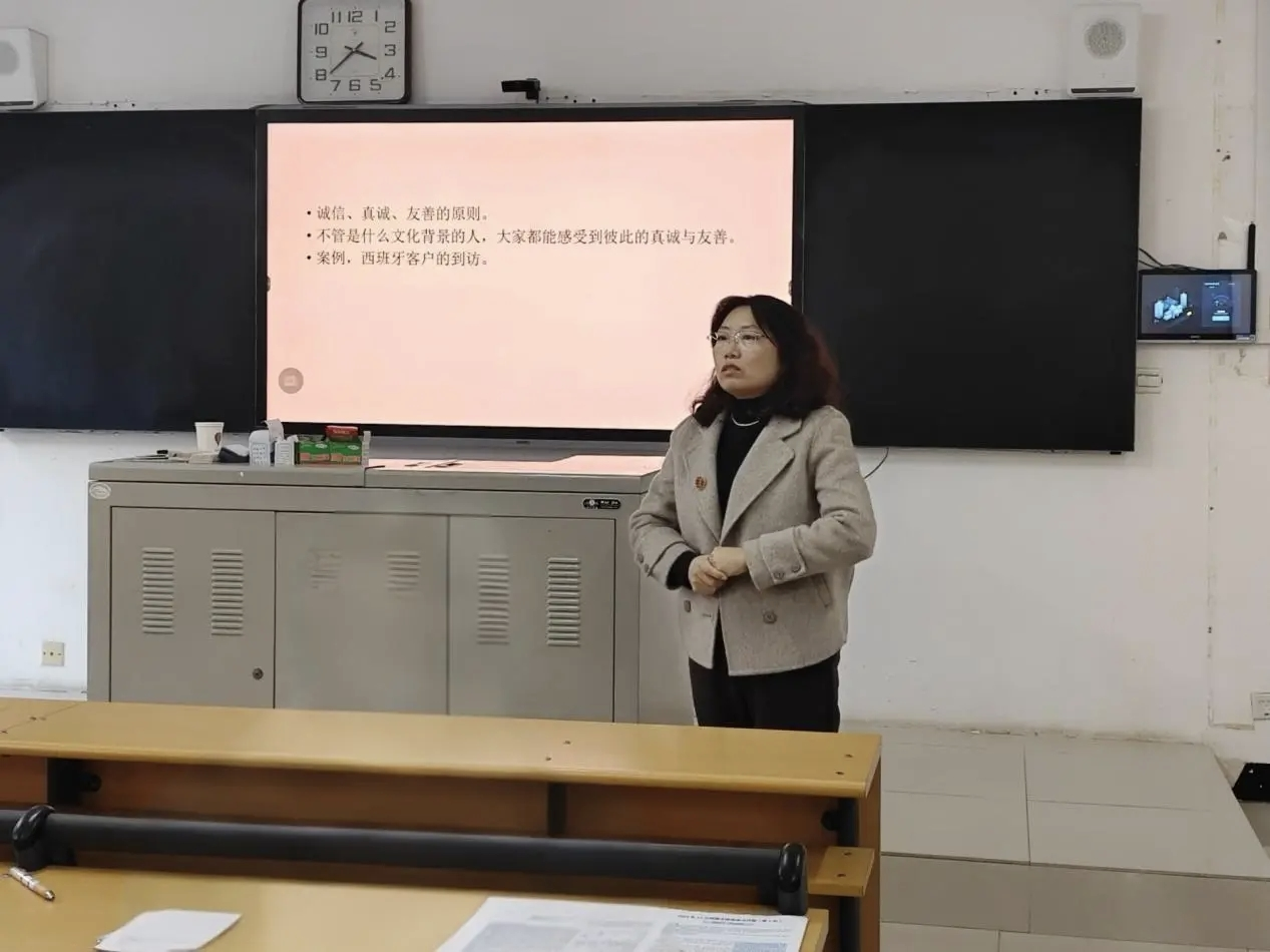 课上,金义俊老师凭借自身丰富经验,为同学们讲述了跨文化沟通的主要障碍与挑战以及如何进行有效的跨文化沟通。她指出,对待文化差异,同学们需要始终保持尊重的态度,以诚待人,善于运用同理心和换位思考的能力,尤其注意不同文化下的礼仪问题,培养文化敏感度,有效搭建跨国商务交流的桥梁。金义俊老师在最后强调,中华文化是跨文化沟通的核心根基,作为商务英语专业学子,既要坚守文化根本、发挥专业优势,更要将课程知识与实践紧密结合,以扎实的能力赋能个人长远发展。