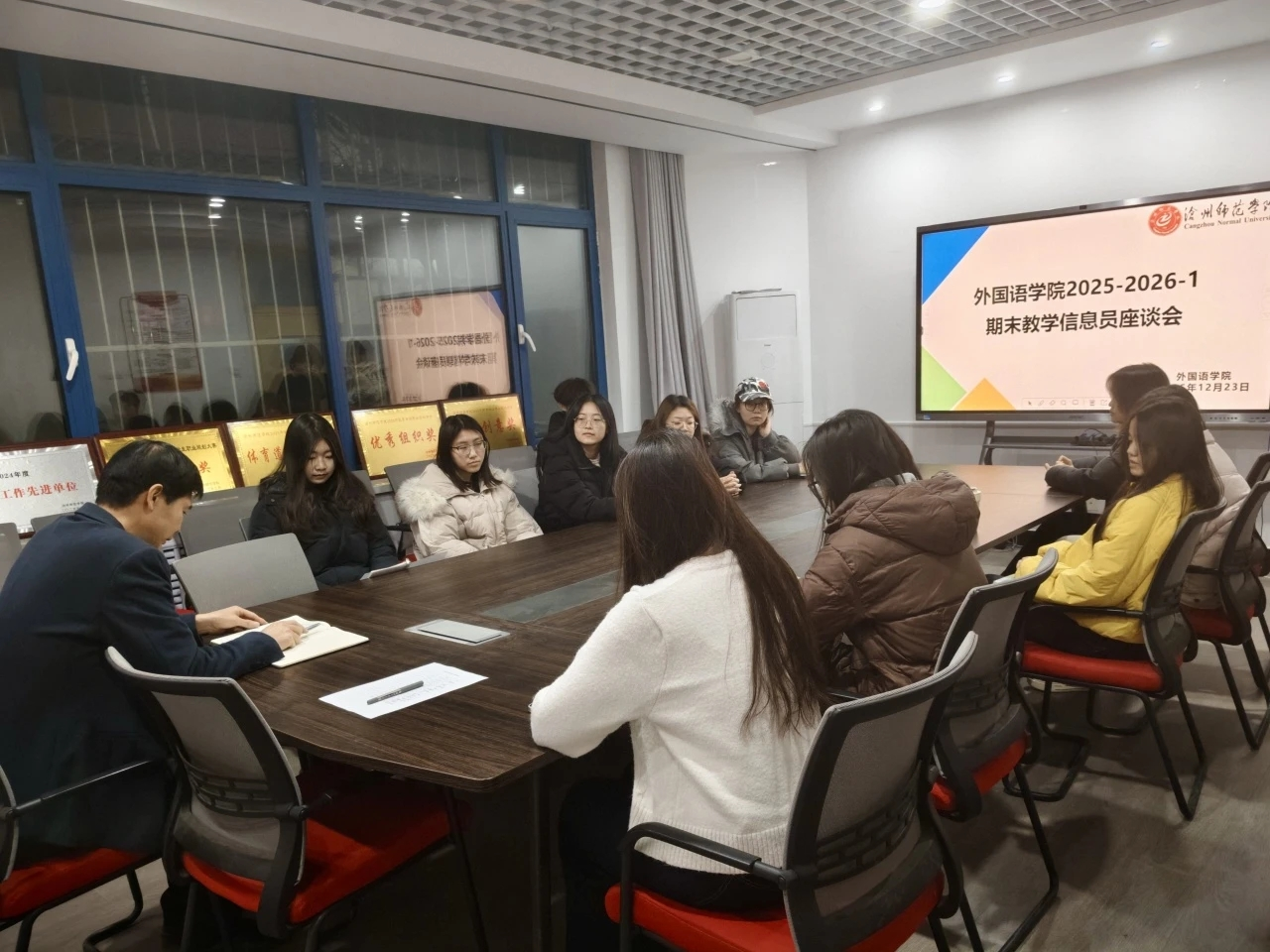 为打通教学反馈渠道、高效落实学生诉求,外国语学院于2025年12月23在文科楼新会议室召开2025-2026第一学期期末信息员座谈会。副院长徐广林与各年级专业学生代表交流,聆听诉求与建议。