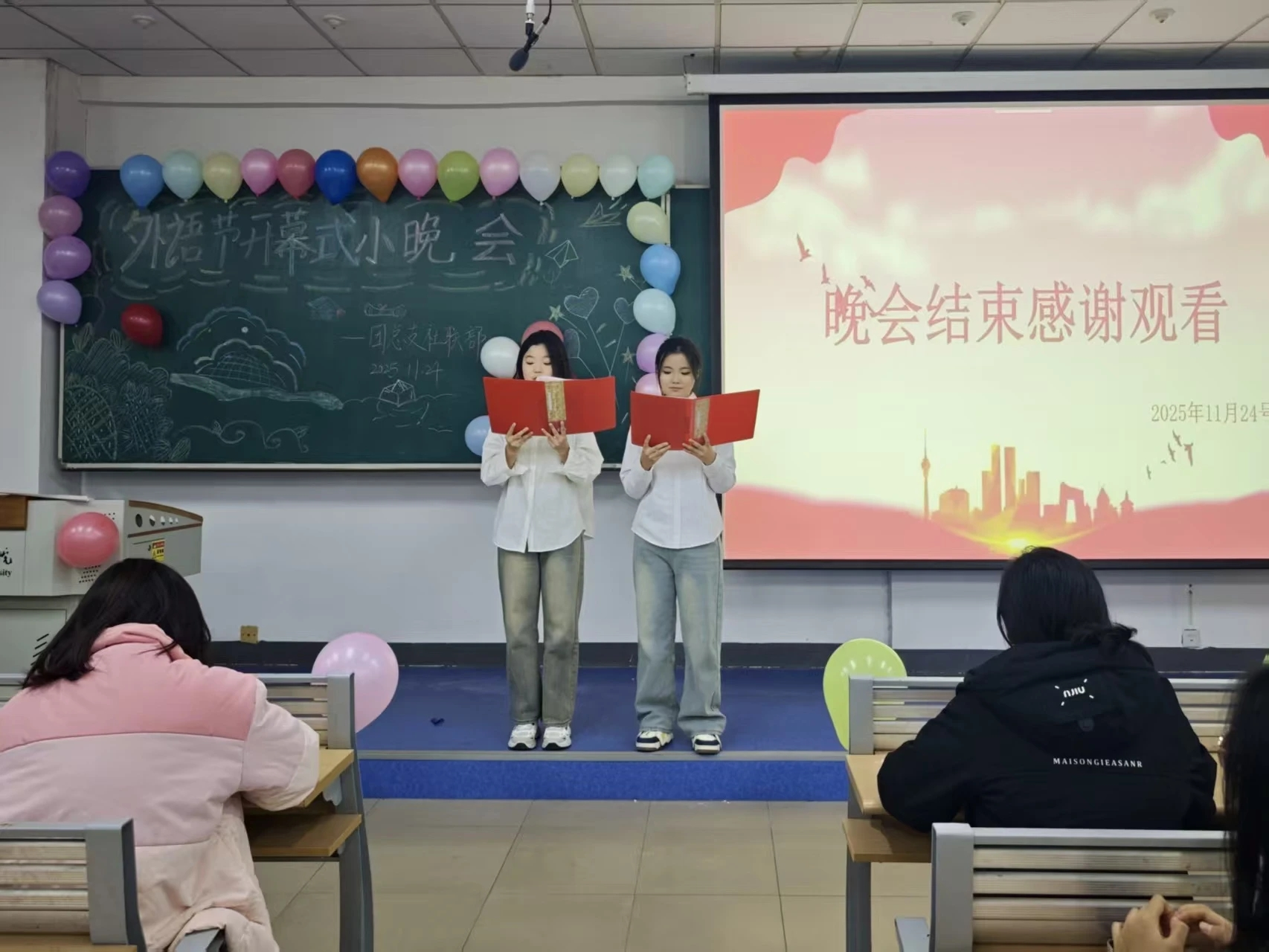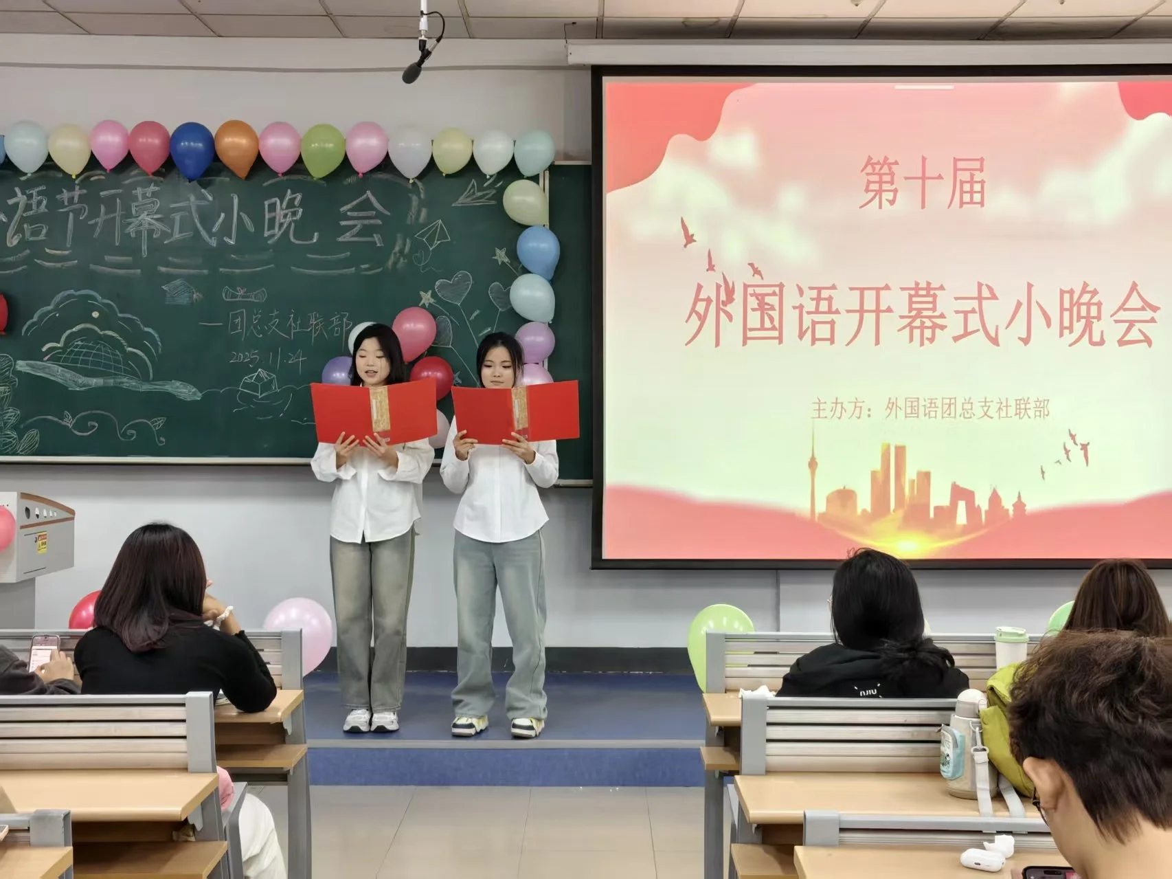 当外语的韵律碰撞青春的热情,当知识的趣味点亮校园时光。2025年11月24日晚,外国语学院团总支在文科楼第四阶梯教室隆重举办第十届外语节开幕式晚会